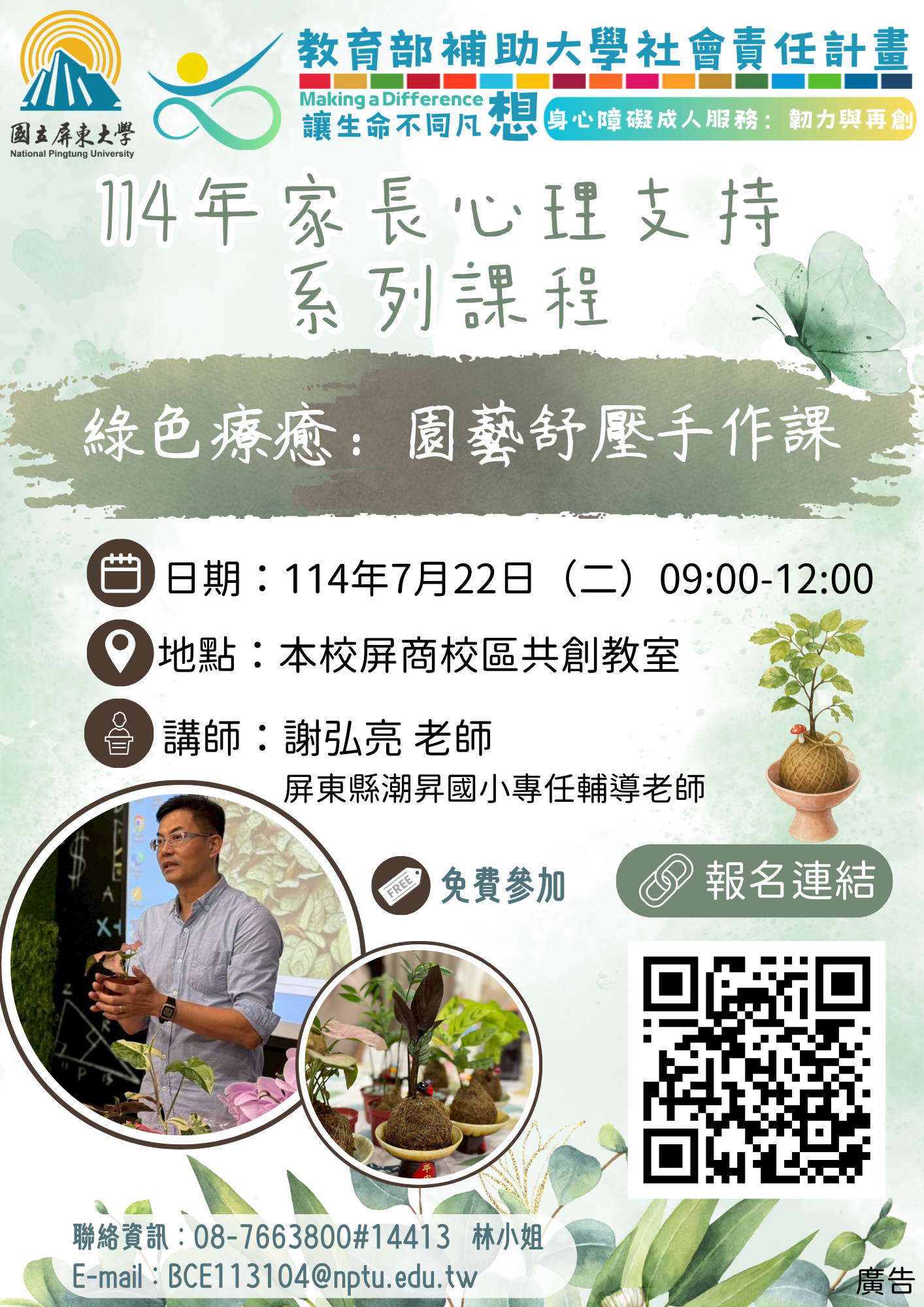 114年USR讓生命不同凡「想」:114年【課程】114年USR讓生命不同凡「想」:家長心理支持系列課程 「綠色療癒:園藝舒壓手作課」